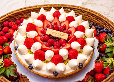 colorful cakes decorated with plentiful fruits.Welcome to our joyful cake shop symbolizing